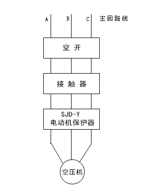 在安裝時(shí),先有三個(gè)主回路線進(jìn)空開,從空開出來后接接觸器,從接觸器出來后接電動機(jī)保護(hù)器,從保護(hù)器出來后接空壓機(jī)。